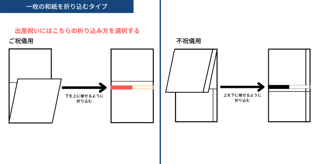 ご祝儀袋の中には封筒タイプではなく、和紙を折り込むタイプのものがあります。裏を織り込む際、祝儀用と不祝儀用では折り方が違います。