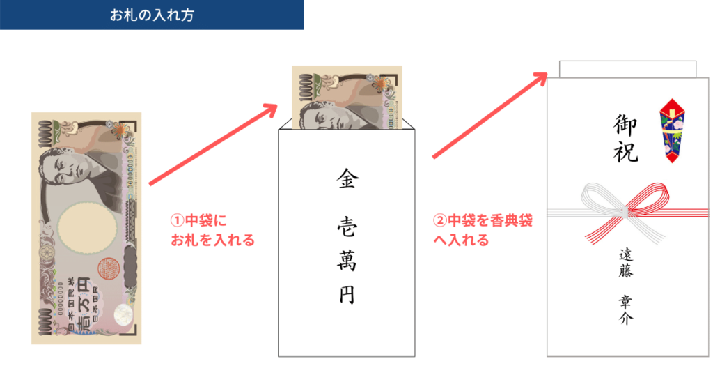 ご祝儀袋にそのままお金を入れるのではありません。まずはお札を内袋に入れ、内袋をご祝儀袋に入れます。