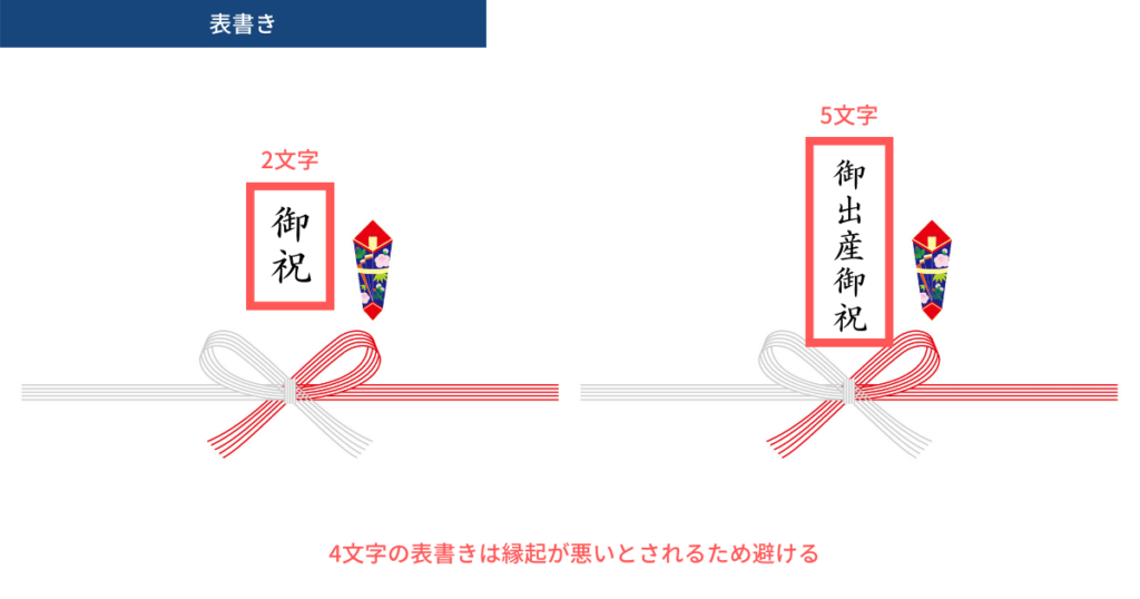 ご祝儀袋の表書きは「御祝」や「御出産御祝」を使用しましょう。「出産御祝」と言った4文字の表書きは避けます。