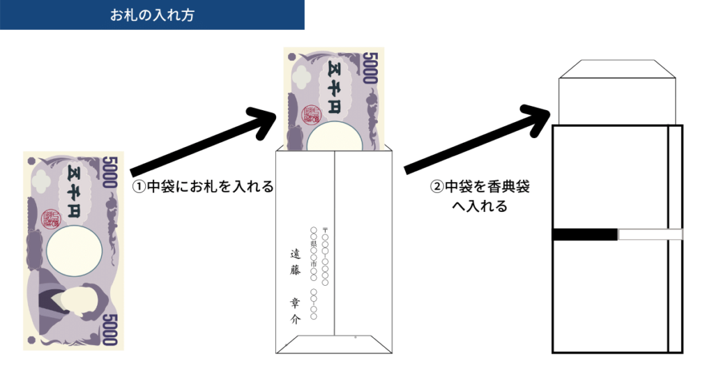 お札の表面(肖像が印字されている側)が香典袋の裏に来るようにし、香典袋の下側に肖像が来るのが正しい向きです。ややこしいため下の画像にてご確認ください。